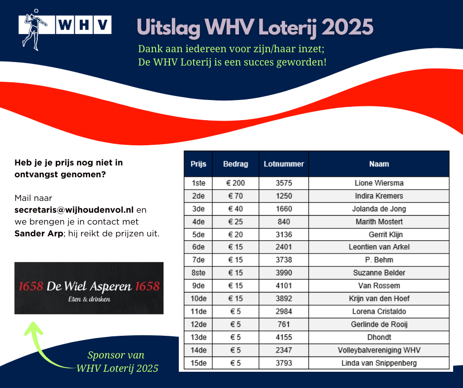 Op maandag 29 december 2025 om 19:00 uur is de WHV Loterij 2025 officieel voltrokken. De trekking werd verricht door Cees Roth in Café-Cafetaria De Wiel in Asperen. Het was een gezellige avond waarbij veel betrokkenheid vanuit de vereniging voelbaar was.